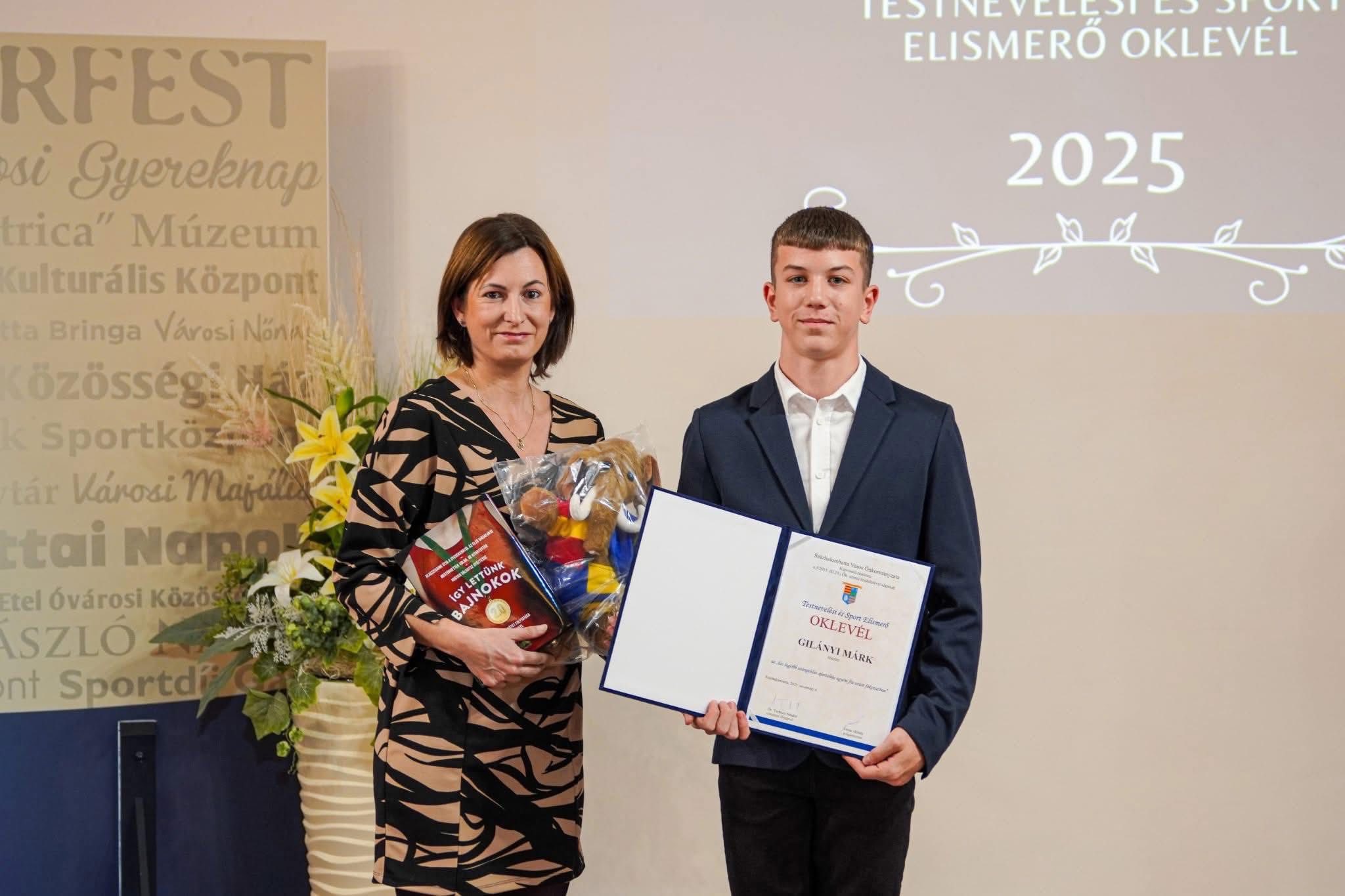 Gilányi Márk 8.b osztályos diákunk utánpótlás kategóriában ezüst minősítést vehetett át városunk önkormányzatától.